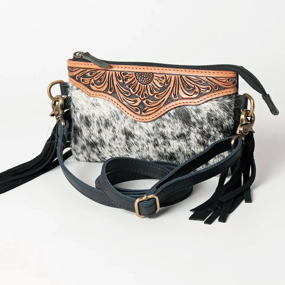 If you are looking for a black cowhide purse look no further! This one has so much character and style. The tooled leather top adds so much to this!!