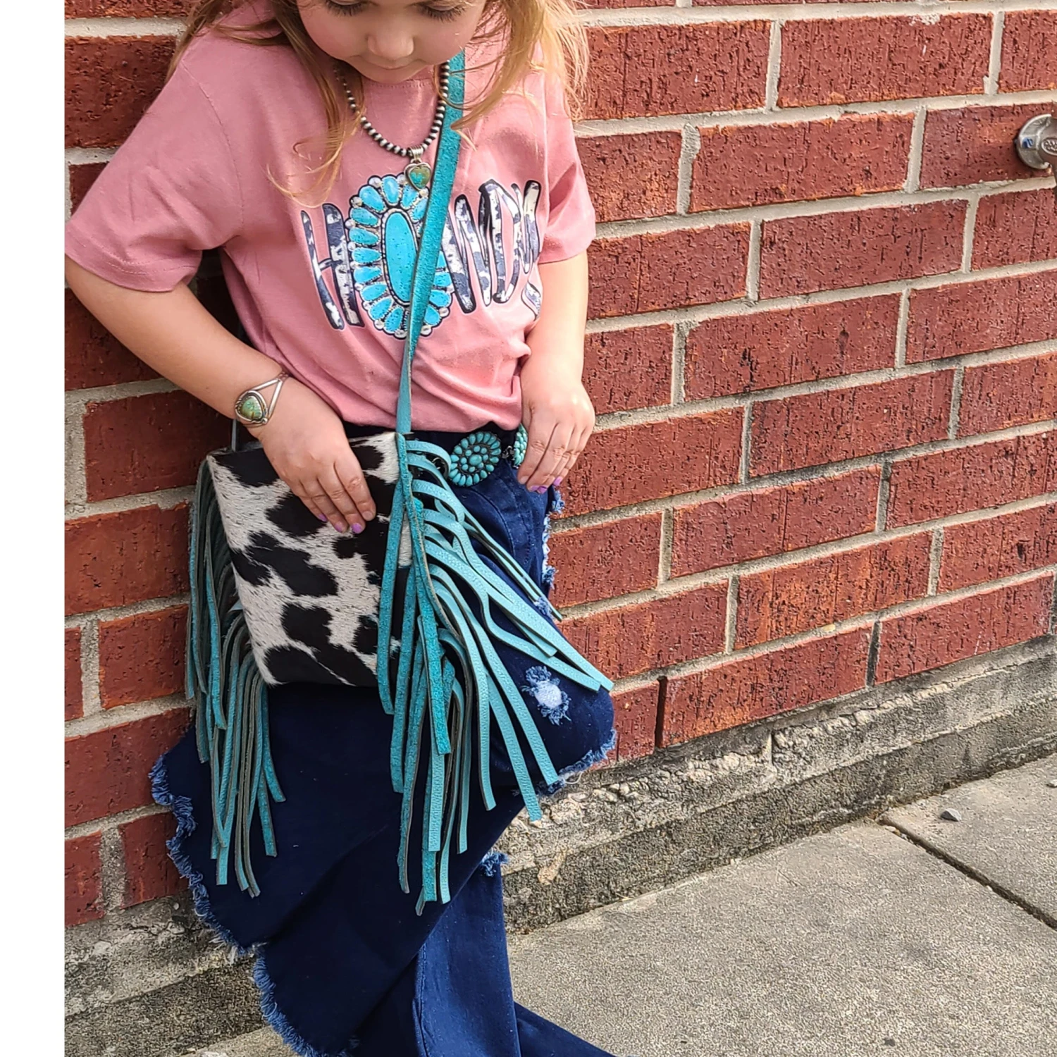 This adorable Black & White Cowhide Mini Purse, with Turquoise Fringe, is perfect for your little Western Fashionista!Â