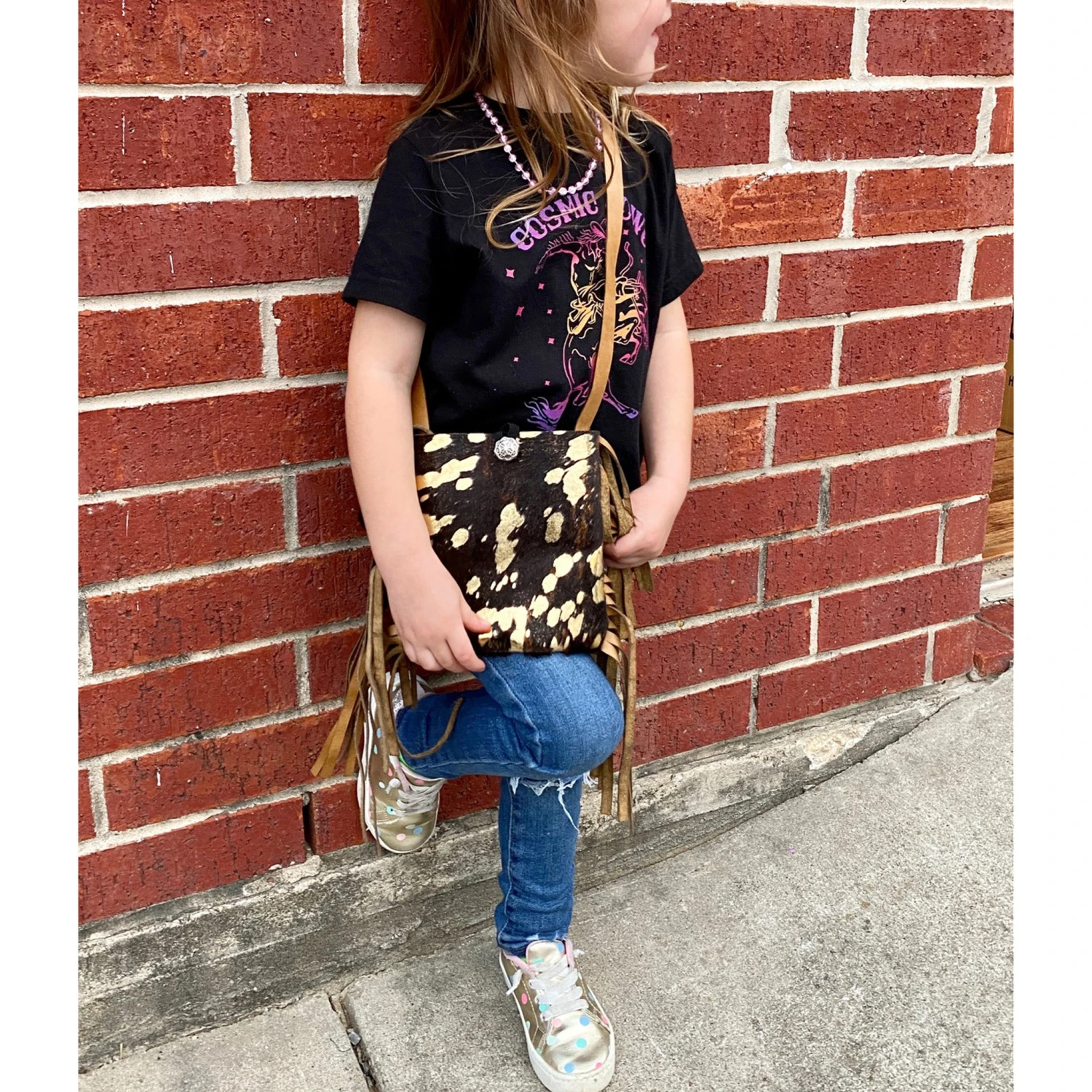 For your little Western Fashionista, this Adorable Brown & Gold Acid Washed Handmade, Mini Cowhide Purse is the Perfect Accessory!Â