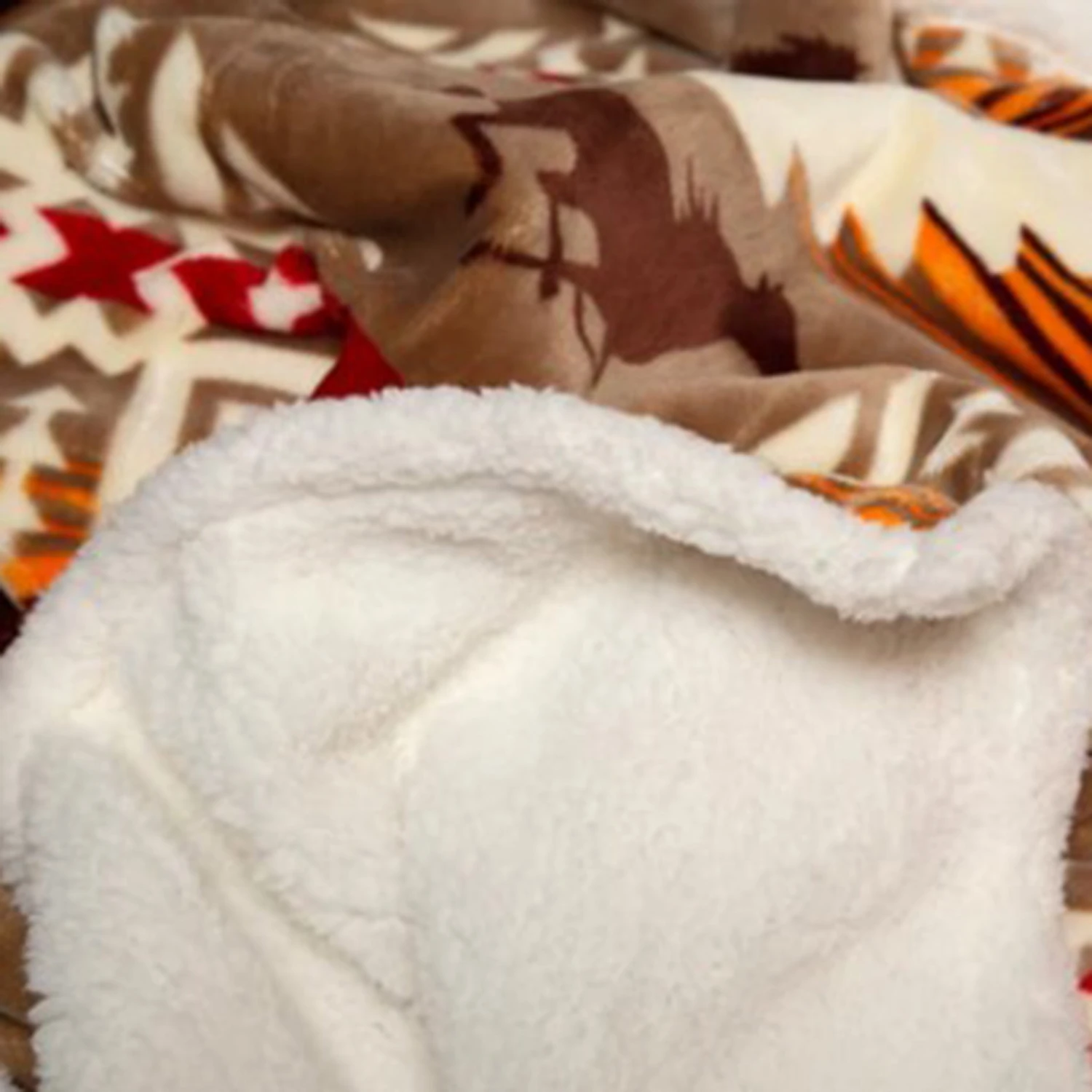 Cuddle up in this beautiful Sherpa backed blanket. It has an Aztec design of browns, oranges, red and white with horses running through it. It will be a perfect accent piece in any room of your house.