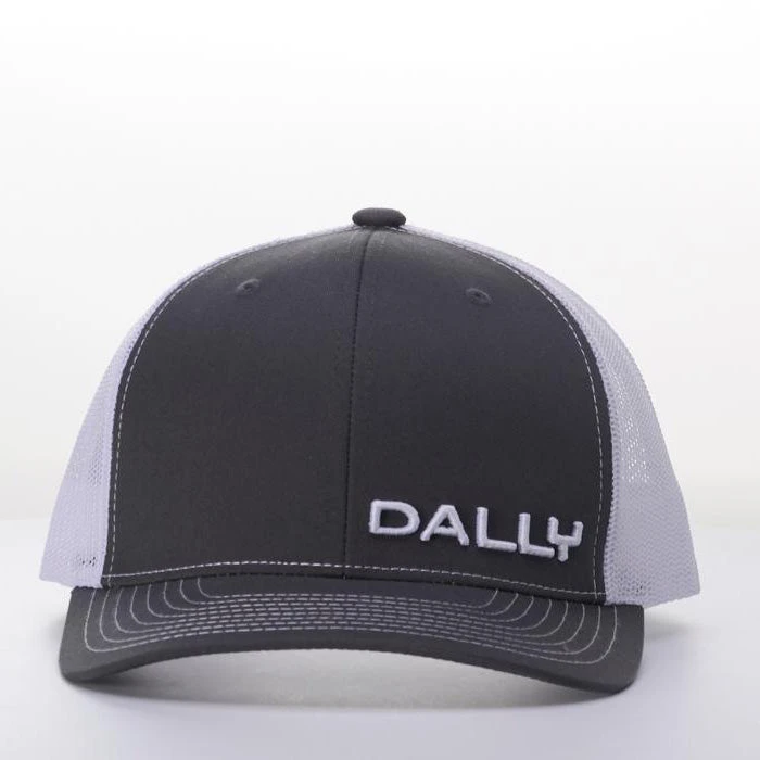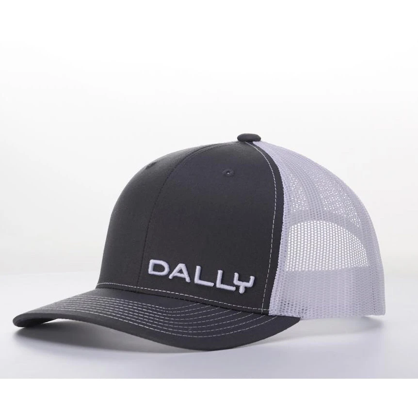 This cap from Dally Up features a charcoal front with small lettering saying “DALLY” in the lower right hand corner. The back is white made of mesh with an adjustable snap closure.