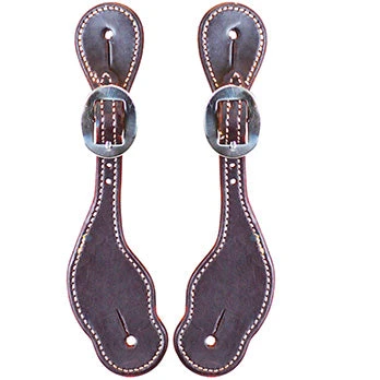 These ladies spur straps are made of a deep latigo leather. They are heavy duty with durable stitched leather and stainless steel buckles.