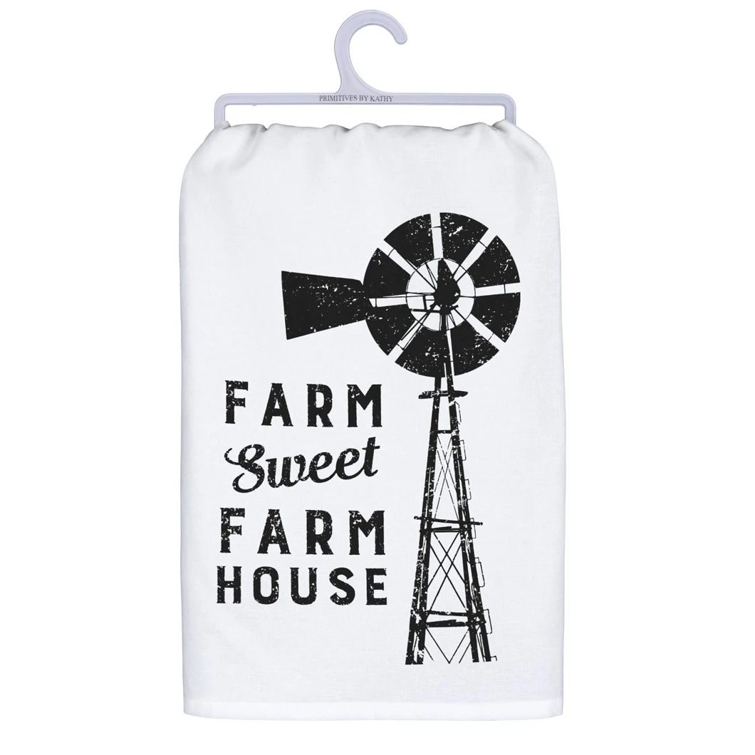 The perfect gift or stocking stuffer for the person with that fun farmhouse kitchen! This hand/dish towel features a distress “Farm, Sweet, Farm House” saying along with a windmill design.Â
