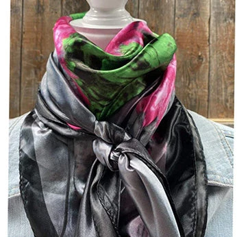 This classic wild rag is in solid steel grey background and black trim decorated with pops of bright fuchsia wild flower. A perfect look for any rodeo event to just a night out on the town.