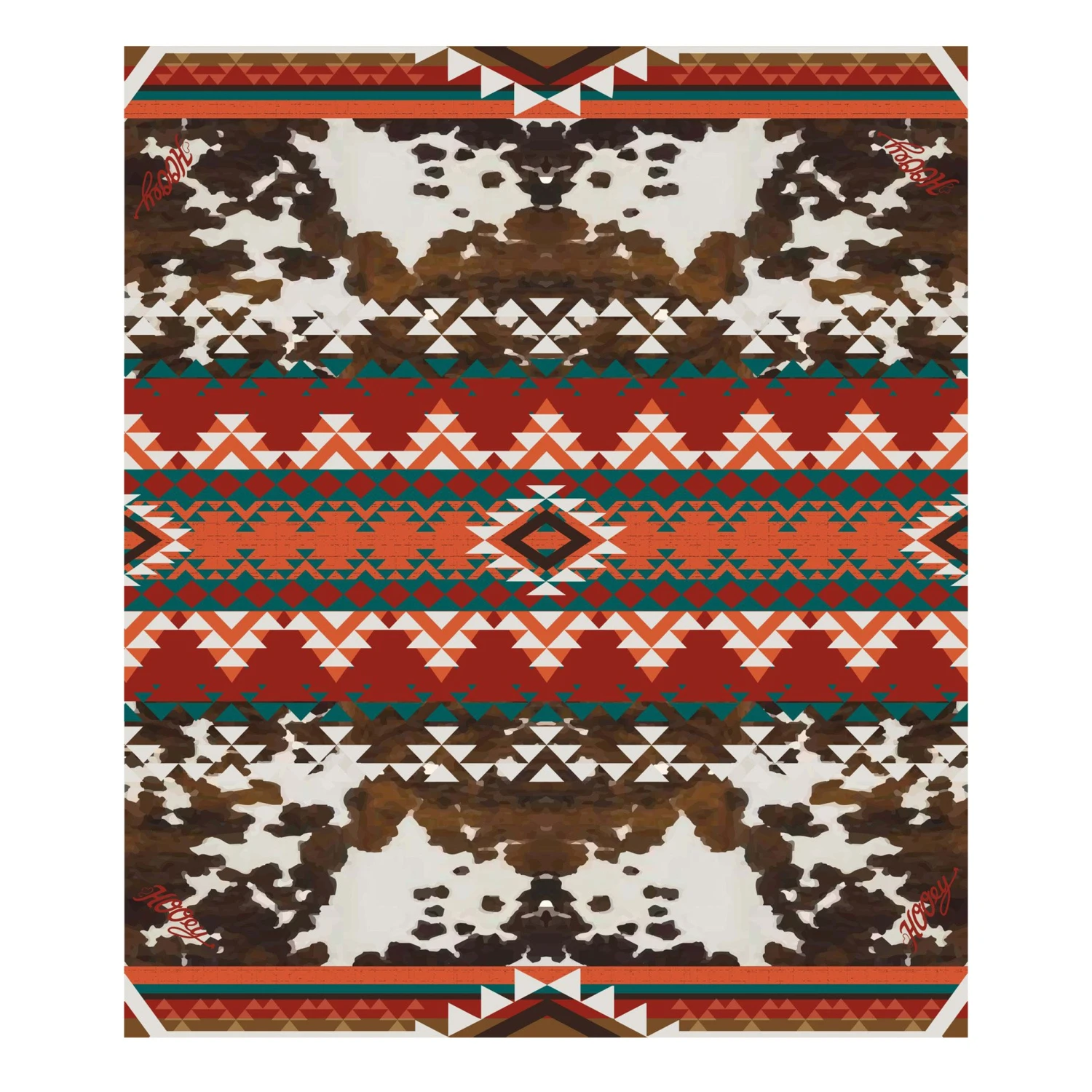 The cow print makes this a fun wild rag! Aztec pattern in red, orange, cream and teal. Measures 25″ x 25″