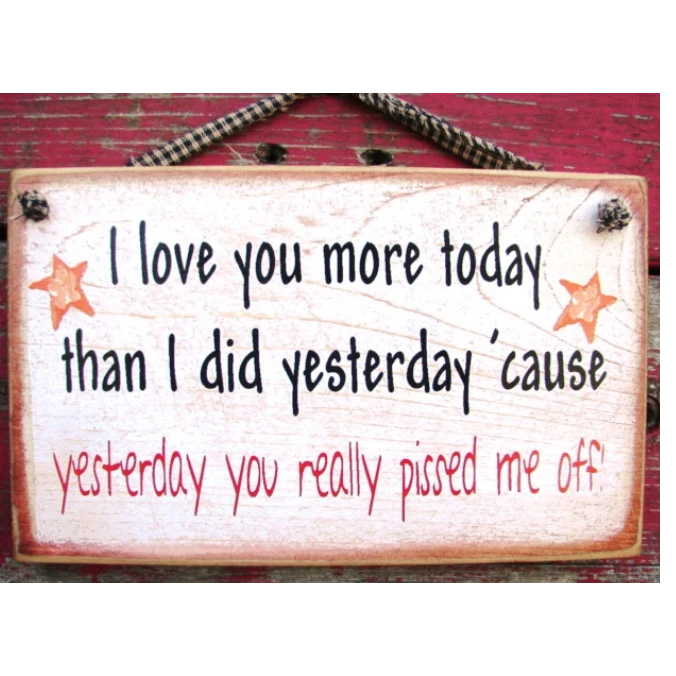 A funny rustic style sign that says “I love you more today than I did yesterday