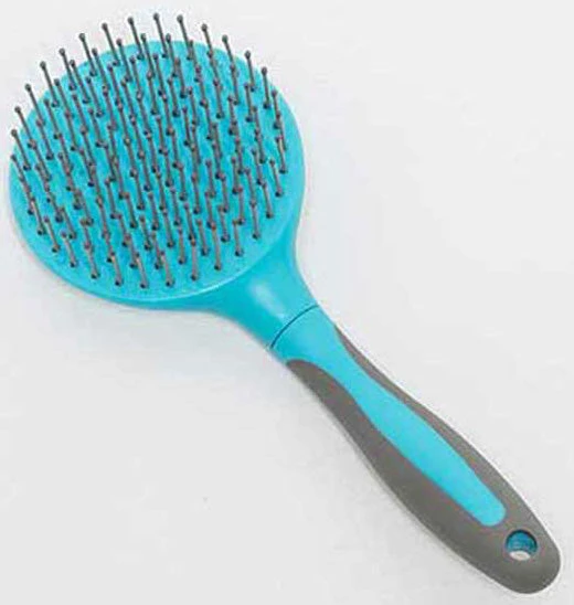Easy to grip mane and tail brush. It has a longer round handle that makes gripping easier. The bristles are plastic, with little round tip to make brushing through the mane and tail easier with less breakage of the hair.
