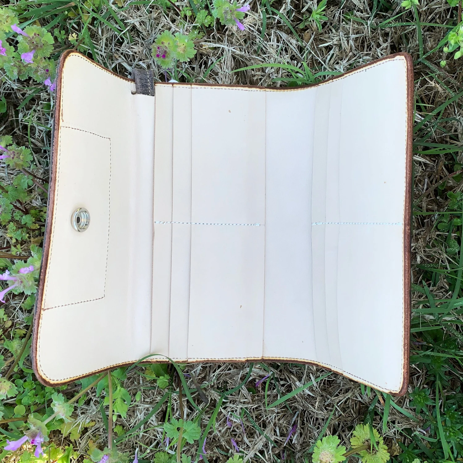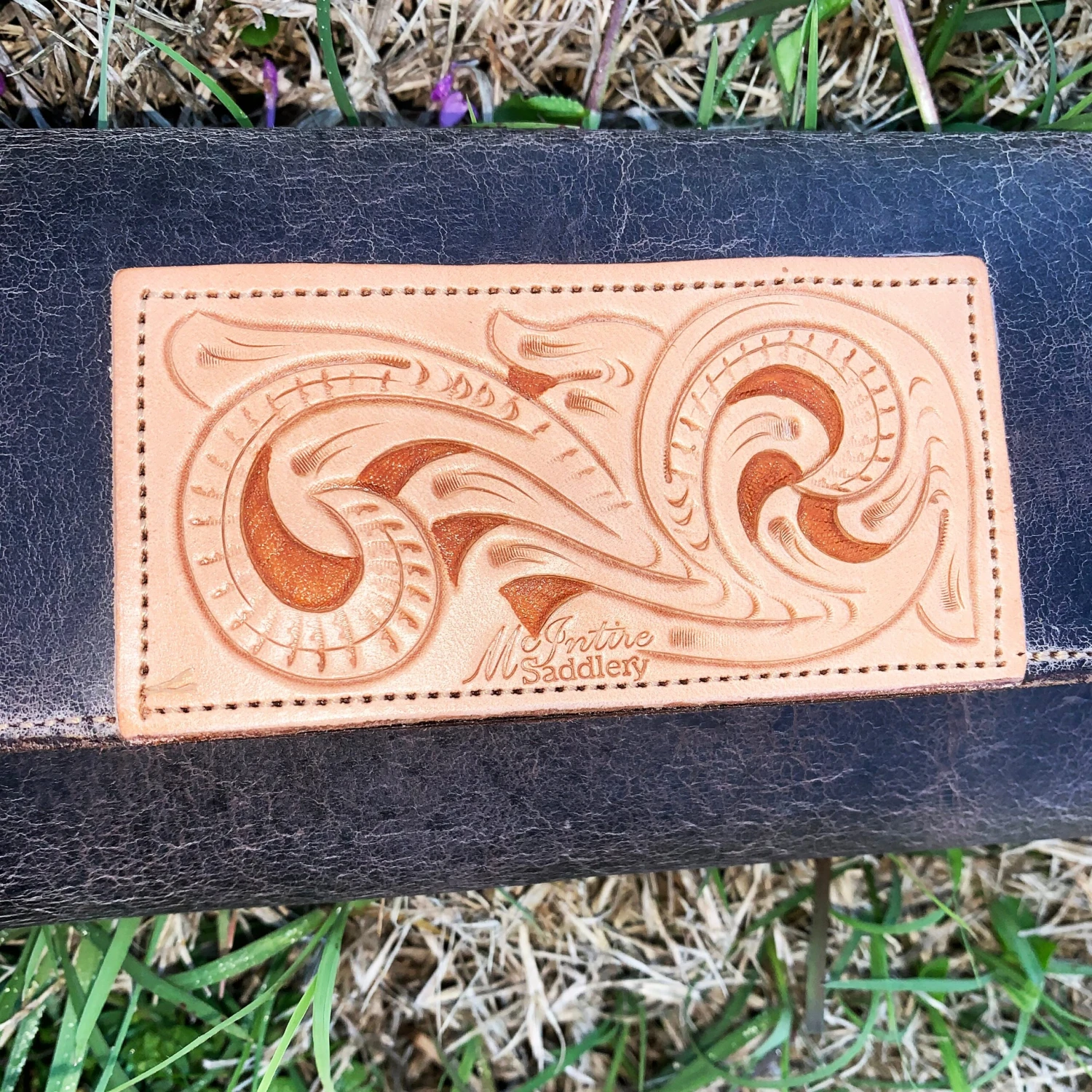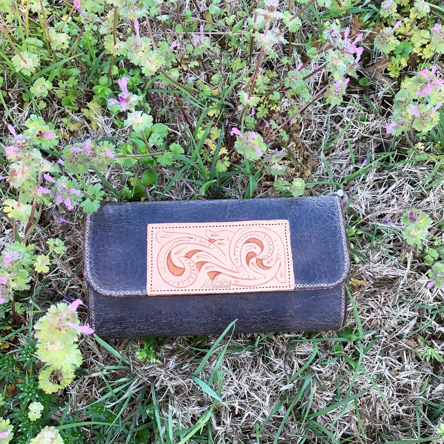 The crackled effect on this wallet makes it looked distressed. The leather patch really stands out against the dark colored wallet. We love this wallet and know you will too.