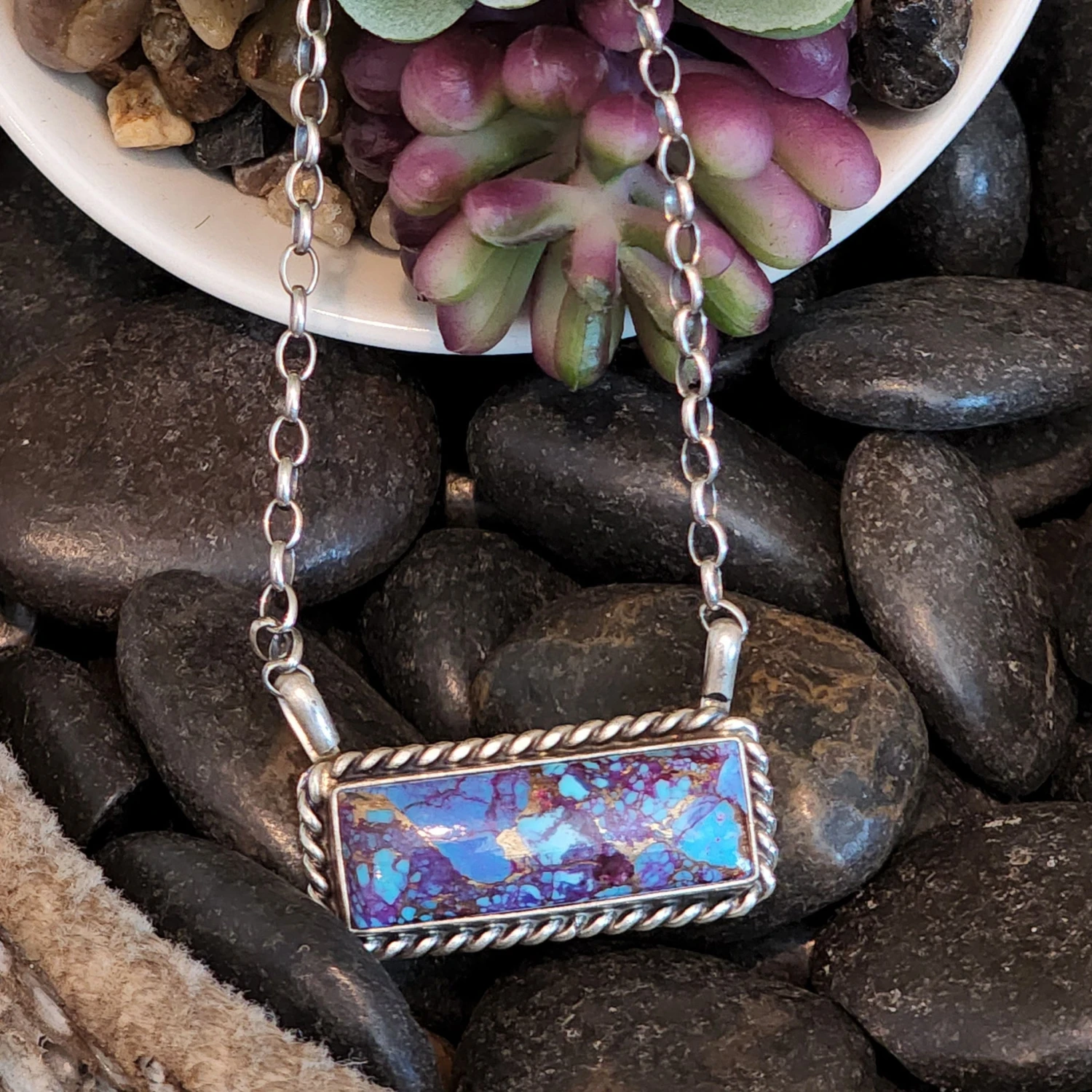 We just love purple Mojave here at the Western Edge! The coloring in these stones is vibrant and eye catching. This cute bar necklace is sure to catch eyes.