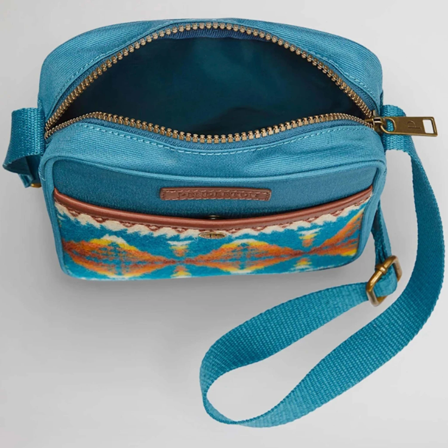 This zip-close canvas crossbody satchel features a large snap-close front pocket crafted from woven-in-USA wool. Roomy interior can hold a small wallet, phone and keys. Leather logo patch. Pattern placement may vary from image shown.
