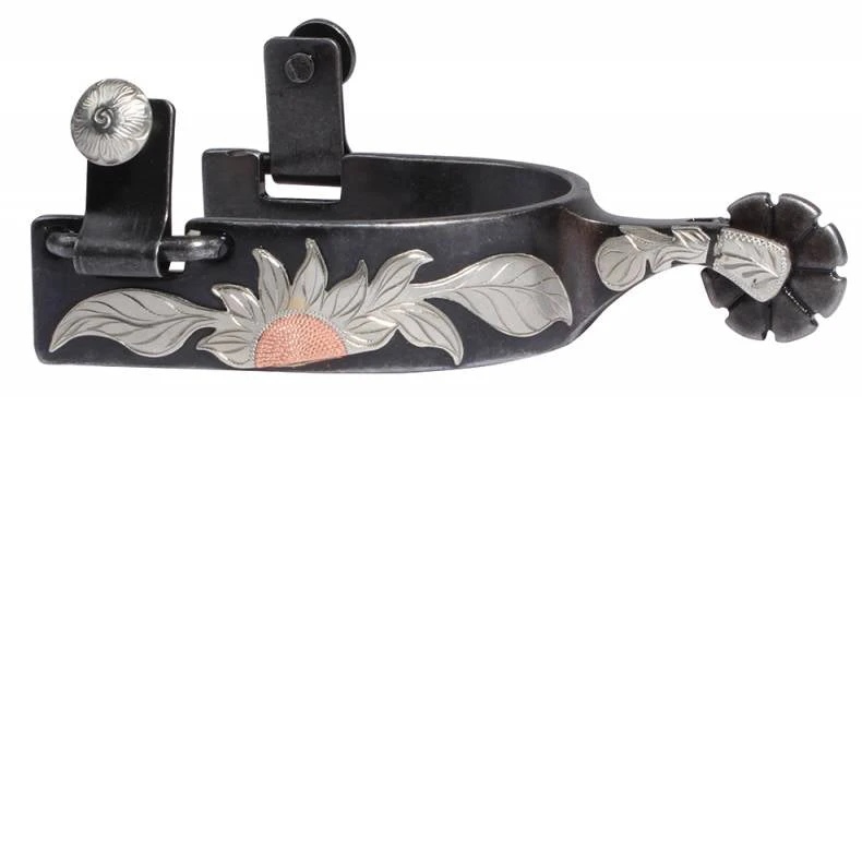 These beautiful Professional’s Choice handcrafted spurs with sunflower design on the 1″ band, with a blunt 8 point rowel are flashy and classic all at the same time.