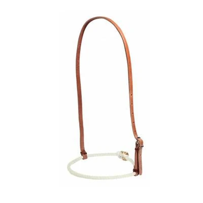 Applies pressure when horse opens its mouth. Nylon lariat rope nose. Hermann Oak harness leather headstrap.