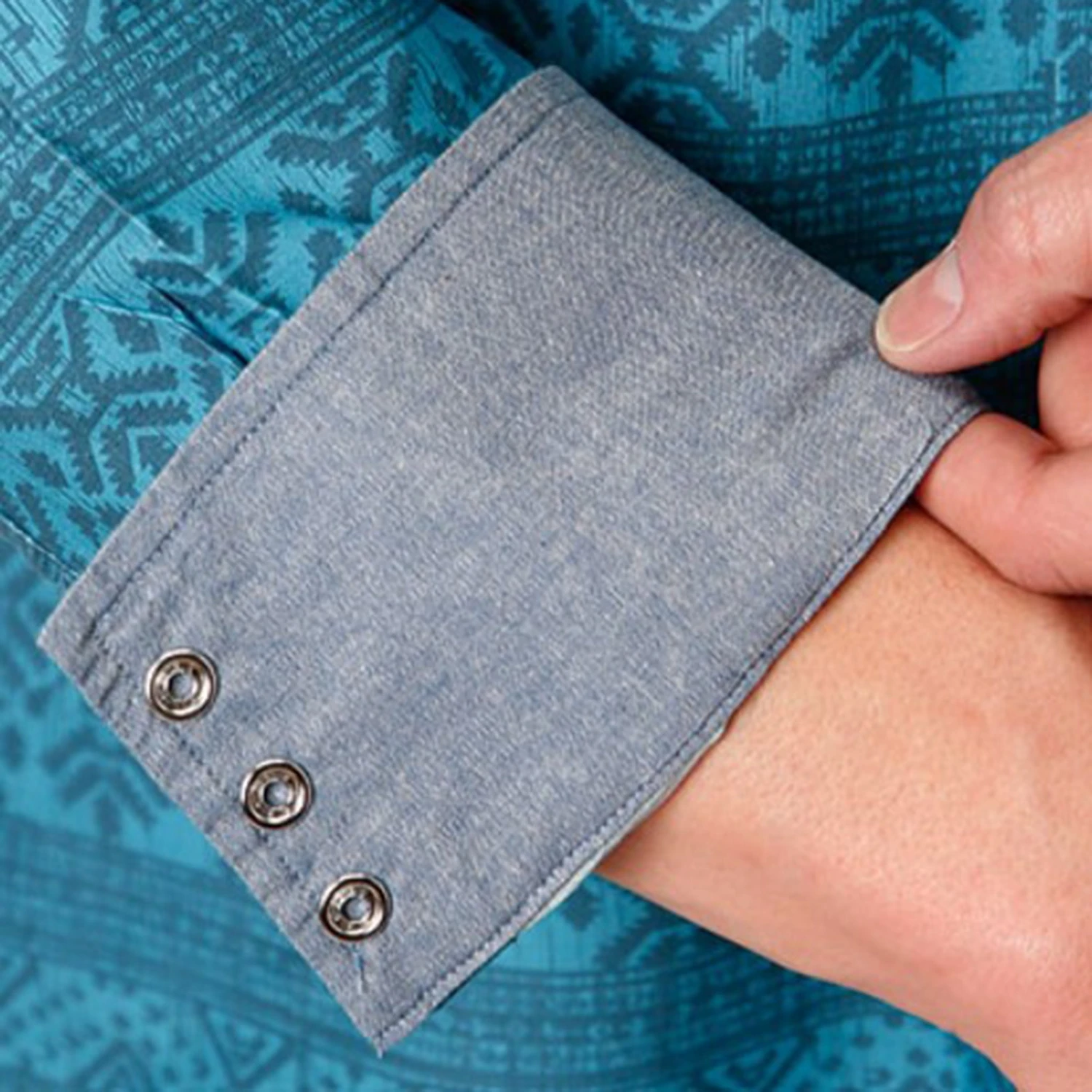 The blue and turquoise blend beautifully together in this Aztec print. It features 1 point front and back yokes, two pockets and a contrasting denim cuff. Perfect for work or a night out.