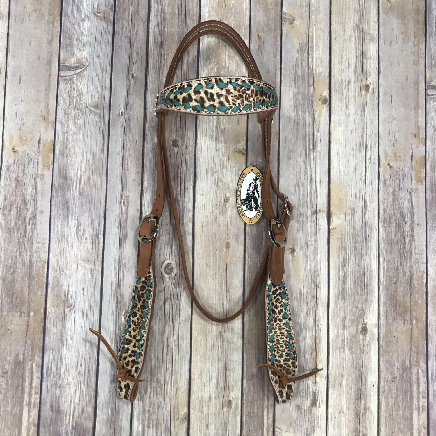 This shaped harness brow features cheetah on the brow and wide cheeks. Hand laced turquoise buckstitch makes a bold contrast against the cheetah for a fun, edgy look.