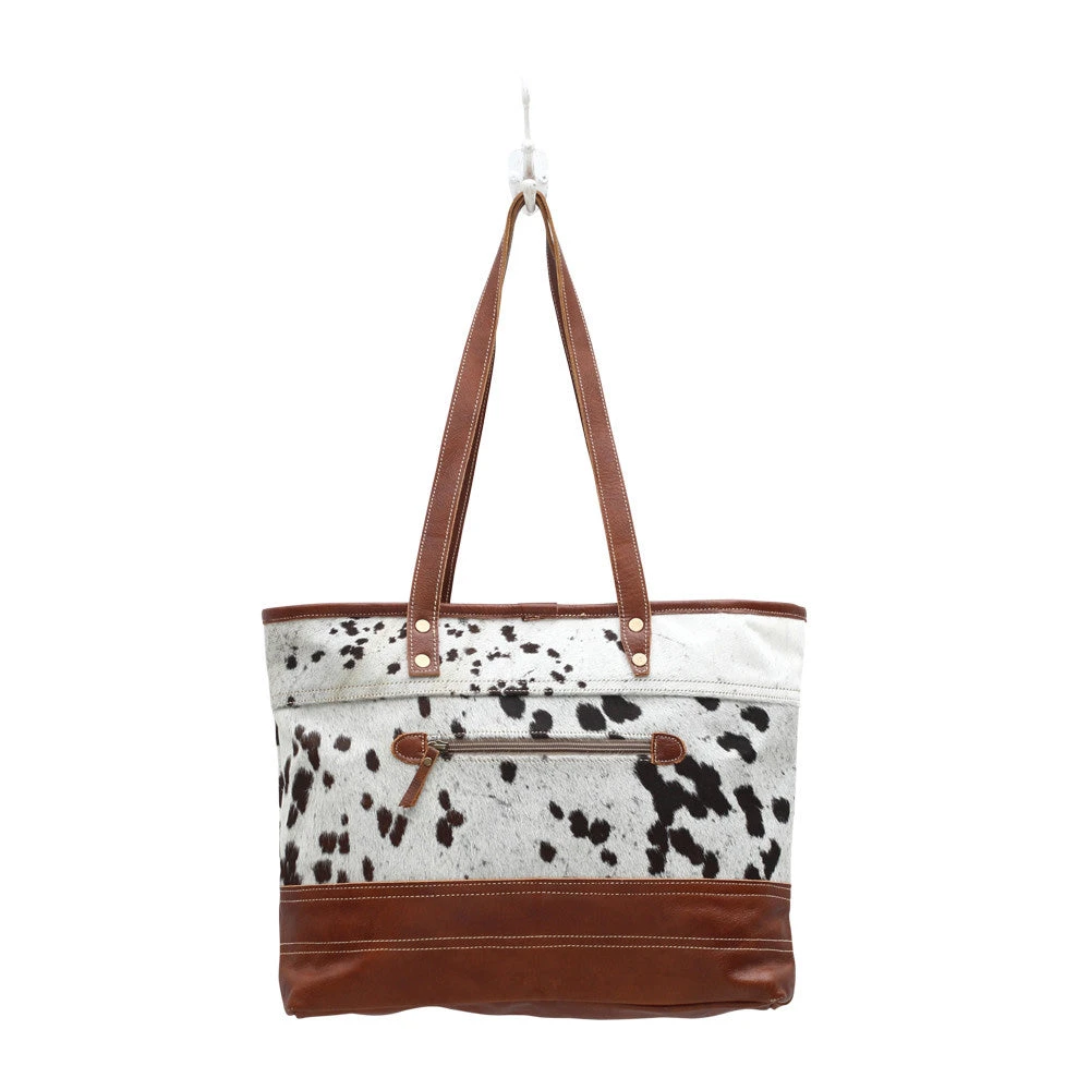 This purse is big enough to hold everything you’ll ever need! The white and black authentic hide is beautiful and the leather compliments the hide very well!