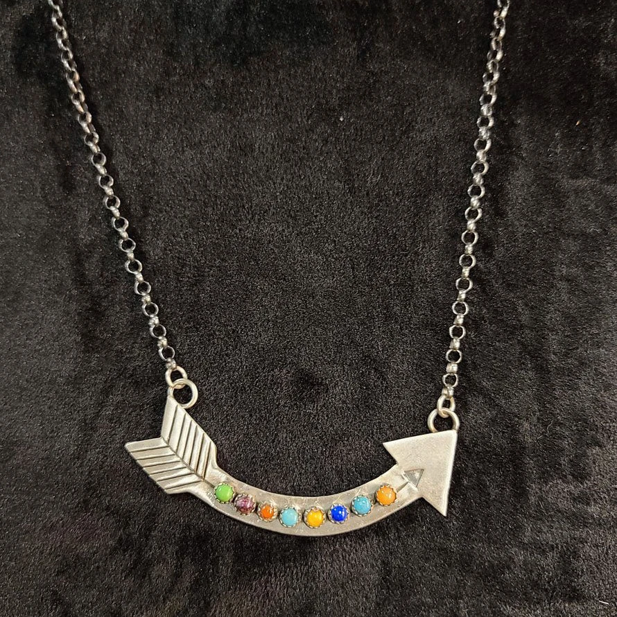 This Zuni SS stamped Multi Color stone Arrow Necklace is so cute! Fun enough to wear with any outfit! We just love the simple details in this Sterling Silver necklace. The arrow is 3 inches in length.